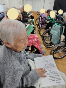 事前に曲目を伺い、入居者様が演奏を聴きながら一緒に歌えるように事務職員が歌詞カードを作ってくれました